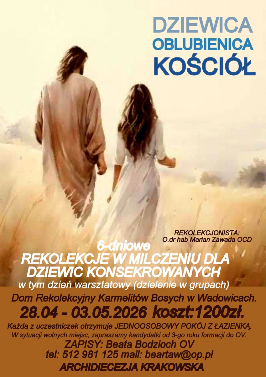 Rekolekcje w milczeniu dla dziewic konsekrowanych poprowadzi o. dr hab. Marian Zawada OCD. Odbędą się one w Domu Rekolekcyjnym Karmelitów Bosych w Wadowicach. Koszt 1200 zł.